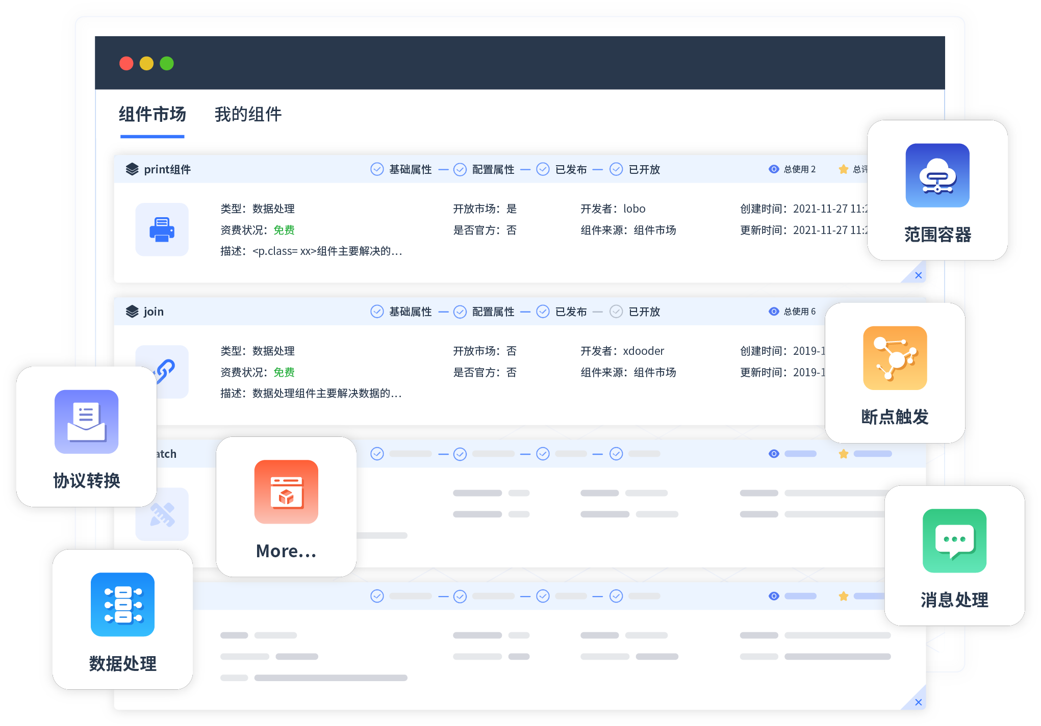 针对集成场景,,VIVO钱包提供组件市场,,,例如协议转换、、消息处理、、、文件操作等。。。。除平台提供的组件外,,,,客户可以自定义所需组件。。。。