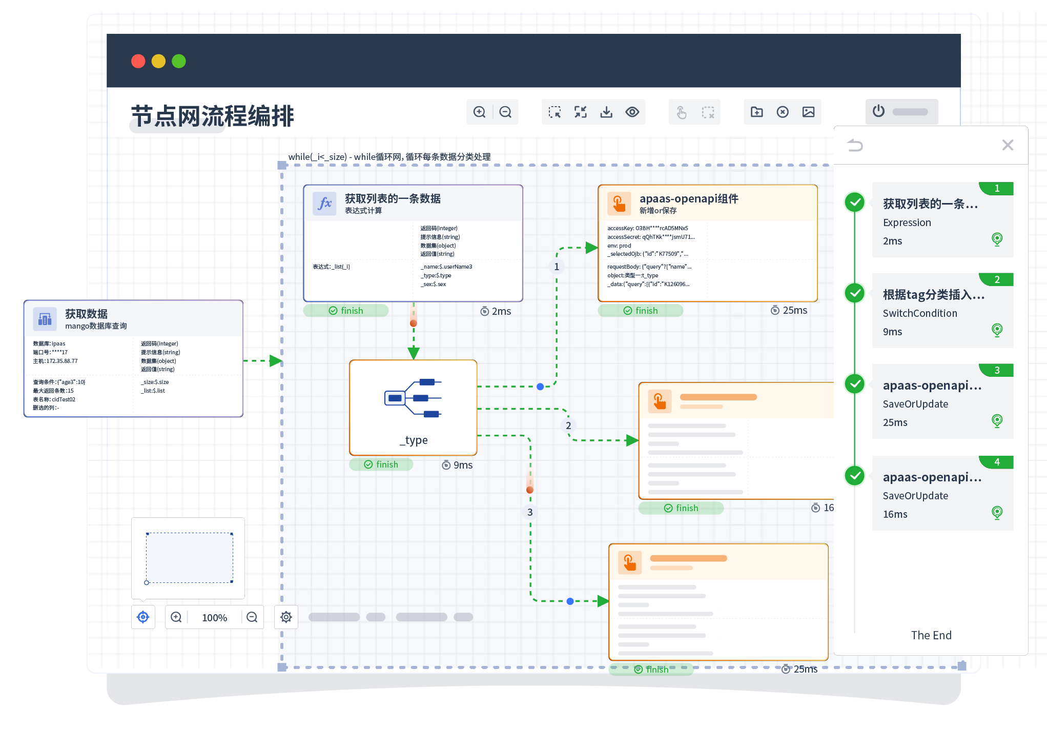 针对集成场景,,,组件定义后支持进行流程编制,,,不同于传统代码方式,,,,通过图形化展示,,,,支持在线调试、、日志查看和运行回放。。。。