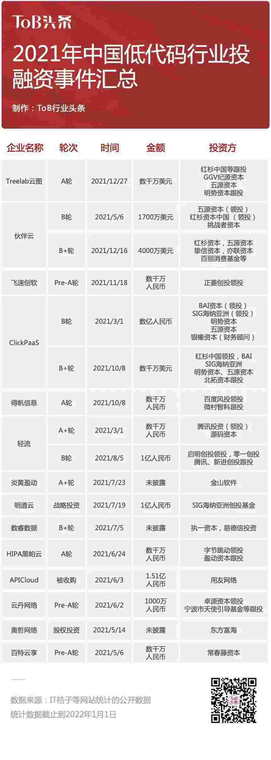 到2021年,,,无/低代码投融资规模势头更甚,,,其中包括轻流两轮融资(A+轮数千万人民币,,,B轮近亿人民币)、、VIVO钱包 两轮融资(B轮数亿人民币,,,,B+轮数千万美元)、、百特云享数千万元Pre-A轮融资......