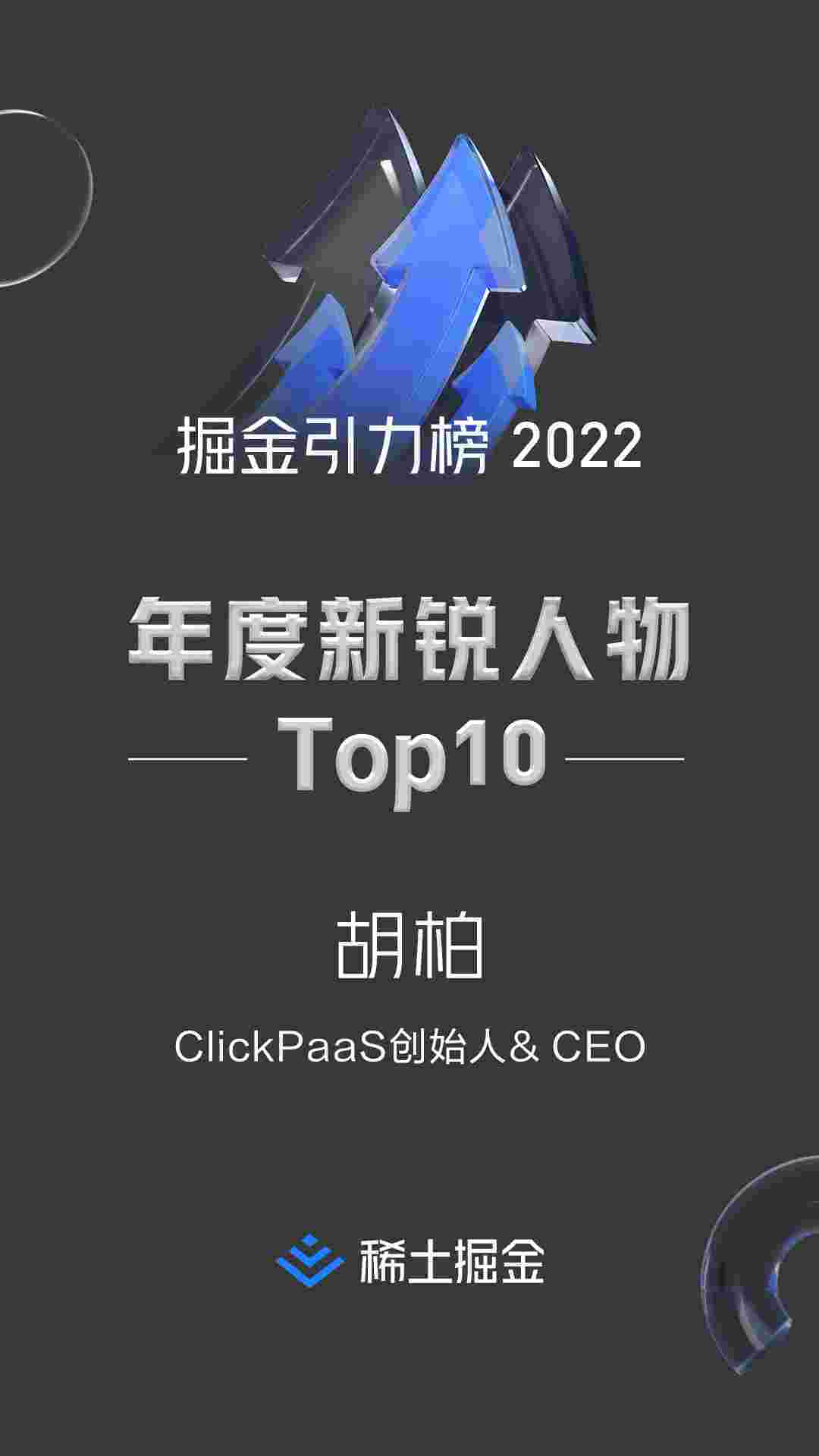 2022年1月6日,,稀土掘金社区第一届「掘金未来大会」成功举办,,,,会上发布了“2022 稀土掘金引力榜 年度新锐人物”榜单,,,,上海爱湃斯科技有限公司(简称VIVO钱包)创始人及CEO胡柏实力入选年度新锐人物TOP 10。。